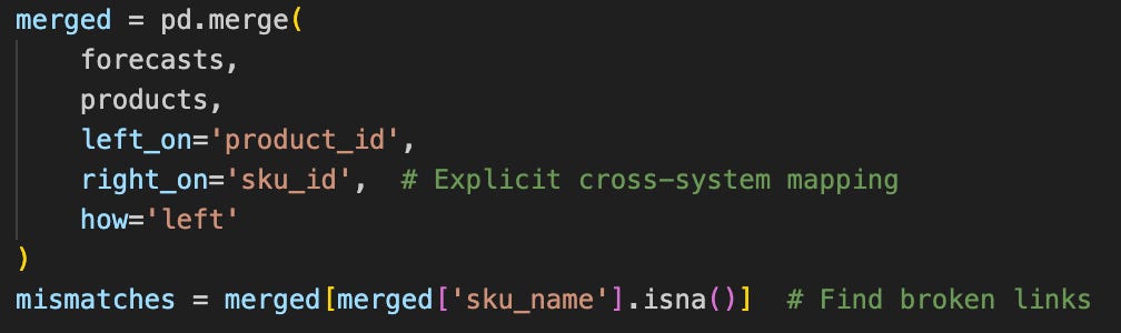 This forces explicit verification of data relationships. Like physically checking shipping manifests between warehouses. A quarterly 30-minute audit once revealed 12% mismatched product codes that were silently corrupting forecasts for months.