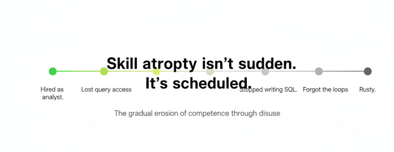 When your job doesn’t require you to write queries, you stop writing them. Python loops you wrote from memory are starting to require documentation lookups. SQL syntax blurs at the edges. The joins you knew cold become joins you have to think about. Skills erode in proportion to how rarely they’re exercised, and manual export workflows exercise almost none of the skills that define analytical competence.