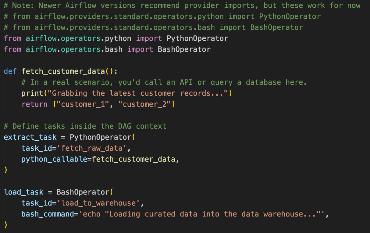 Now, let’s translate this factory blueprint into code. Every DAG you ever write will be built from these core pieces.