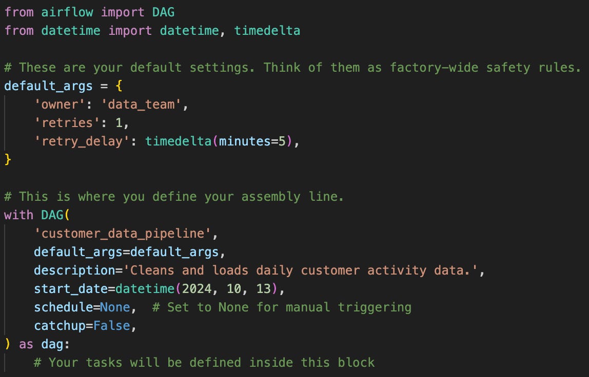 First, you define the DAG object. This is the container that holds your entire workflow. Here, you set the pipeline’s operational parameters: its name, how often production runs start (schedule), the start time of the first run, and the action to take if a task fails.